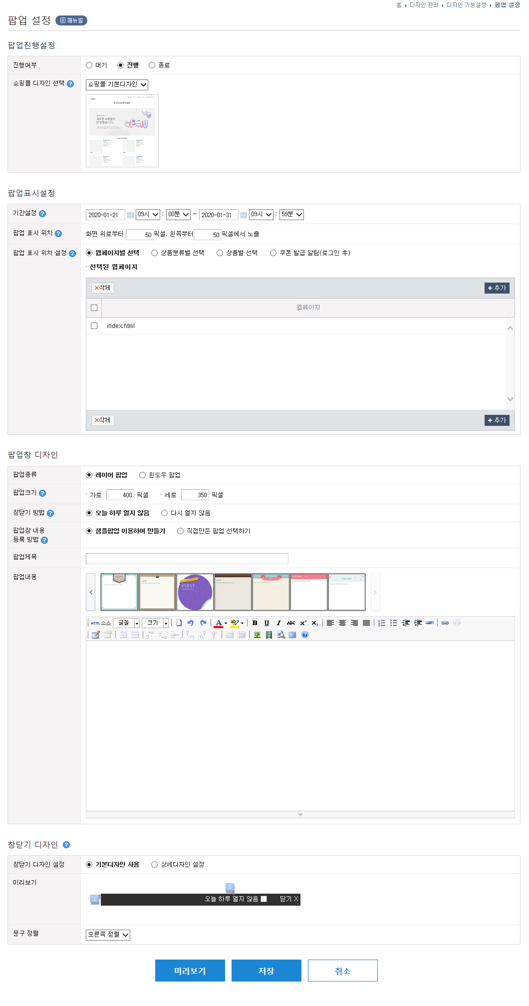 카페24 관리자 - 디자인관리 - 디자인 기능설정 - 팝업설정 - 팝업등록