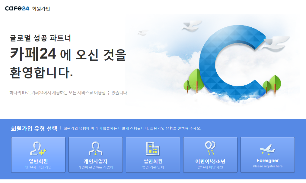 글로벌 성공 파트너 카페24 에 오신 것을 환영합니다. 하나의 ID로, 카페24에서 제공하는 모든 서비스를 이용할 수 있습니다. 회원가입 유형 선택 회원가입 유형에 따라 가입절차는 다르게 진행됩니다. 회원가입 유형을 선택해 주세요.